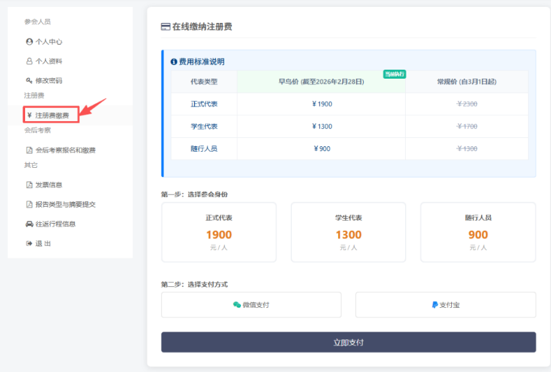 登录后,进入“个人中心”的“注册费缴费”页面,按以下步骤操作: